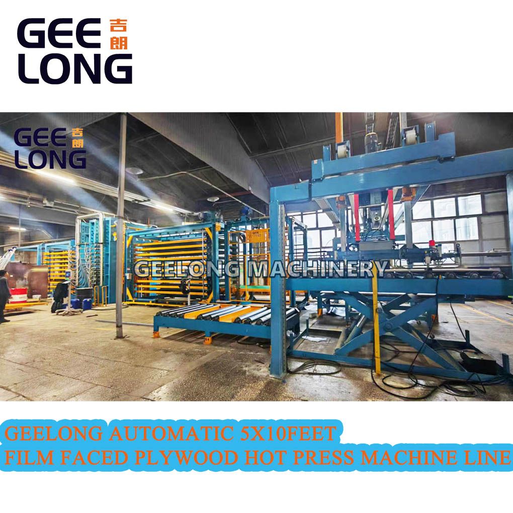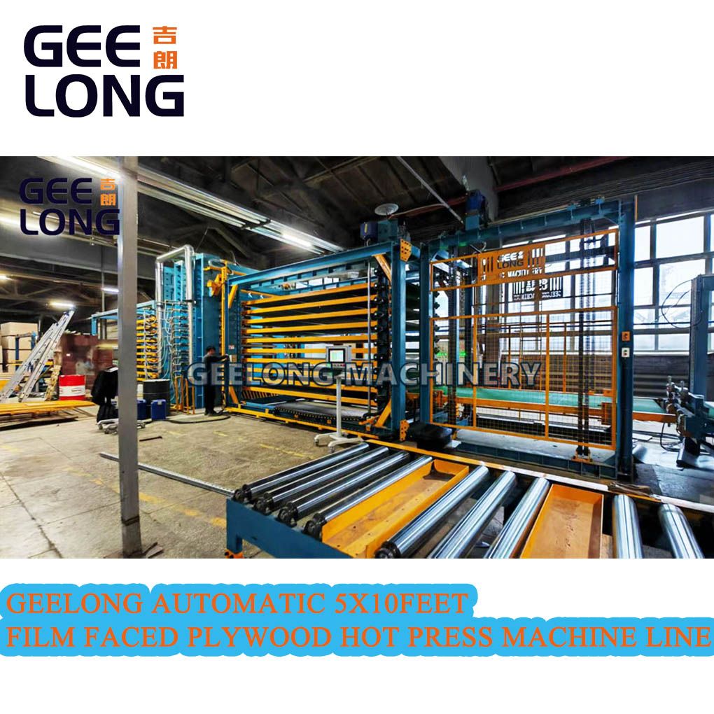Geelong Automatic 5x10feet Film faced plywood hot press machine line, well designed and produced by Shandong geelong machinery equipment Co., Ltd. consist of each parts of this production line, powered roller conveyor, board lifter machine with powered roller, vacuum loader, pre paving belt conveyor with electrostatic device for film faced paper and plywood, longitudinal belt loader, 5x10feet film faced plywood hot press machine, automatic belt unloader, automatic stacking machine, board lifter machine with powered roller, powered roller conveyor for outlet(RGV plywood transport car...etc.), geelong machinery is very professional company in produce automatic film faced plywood hot press machine, we set up so many good lines out of China, all lines are satisfied by our clients, welcome to inquiry if you are needing this film faced plywood hot press machine automatic model.